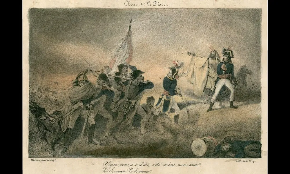 ※「1798年エジプト。エジプト侵攻中に厳しい砂漠の環境に対処するナポレオン・ボナパルト(右)指揮下のフランス軍」19世紀初頭