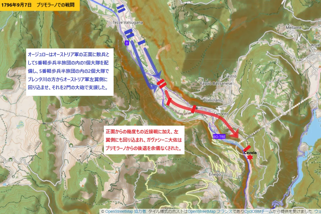 カスダノウィッチ師団の後衛旅団は、ガヴァシーニ(Gavasini)大佐率いる約2,800人が谷の幅が極端に狭くなっているプリモラーノとその後ろに位置するコヴォロ(Covolo)砦の一帯を防衛していた。
