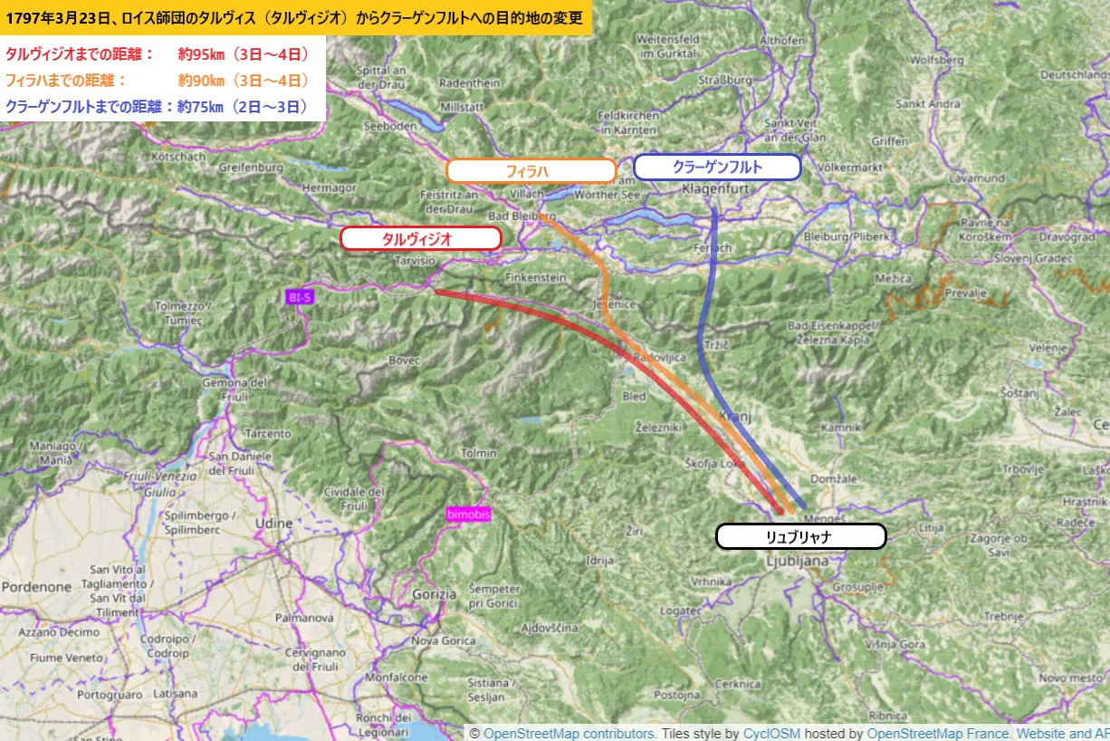 リュブリャナを始点としタルヴィジオとクラーゲンフルトの2つを終点とした場合、クラーゲンフルトへの道の方が1日早く到着するということもあり、3月23日、ロイス将軍は目的地をタルヴィジオではなくクラーゲンフルトへと変更した。